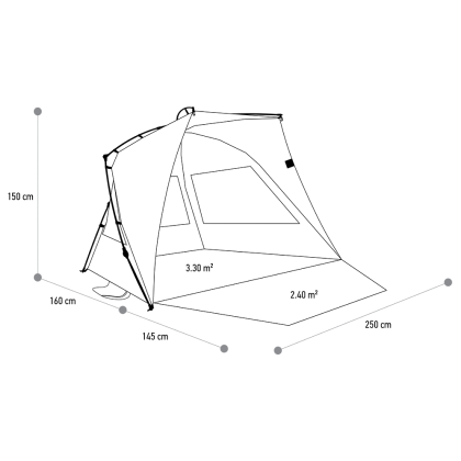 Σκίαστρο Παραλίας για 4-5 άτομα. Από 100% ανακυκλωμένο ύφασμα RPET, κατασκευασμένο από 110 πλαστικά μπουκάλια. Χάρη στον πρωτοποριακό αυτόματο μηχανισμό ESFTM – Easy Set-Up Frame ανοίγει σε 15 δευτερόλεπτα και κλείνει σε 15 δευτερόλεπτα. Με προστασία UPF 50+ από την UV ηλιακή ακτινοβολία. Είναι ανθεκτικό σε άνεμο έντασης έως 7 Μποφόρ. Διαστάσεις 250x160+145 (προέκταση δαπέδου)x150 εκ. (ΜxΠxΥ), Βάρος: 4,3 kg. Υλικό: ύφασμα σκιάστρου 100% ανακυκλωμένο PET, ασημένια επικάλυψη με UPF 50+ για αντηλιακή προστασία. Ύφασμα δαπέδου 100% ανακυκλωμένο PET Oxford με επίστρωση PU.